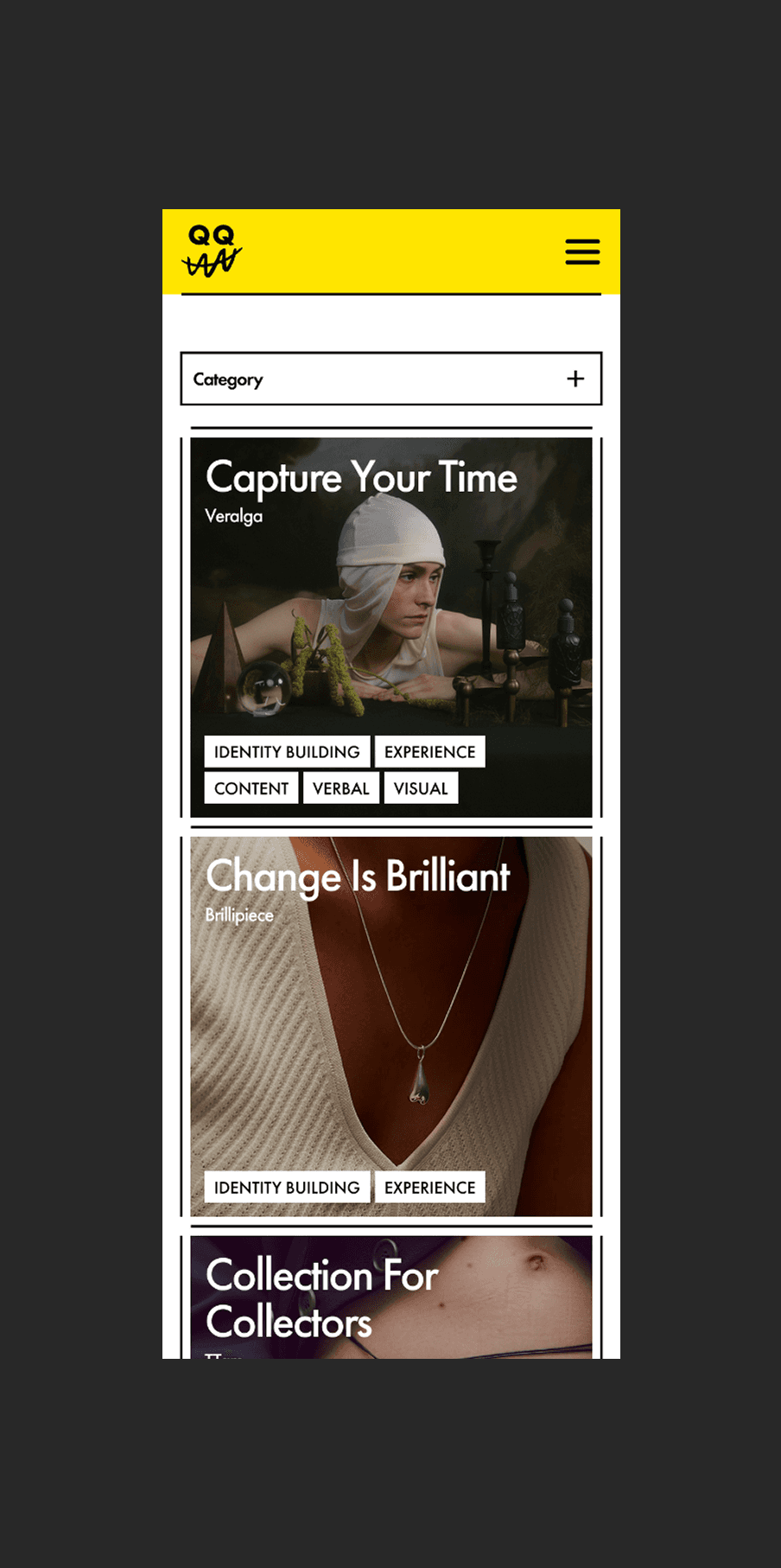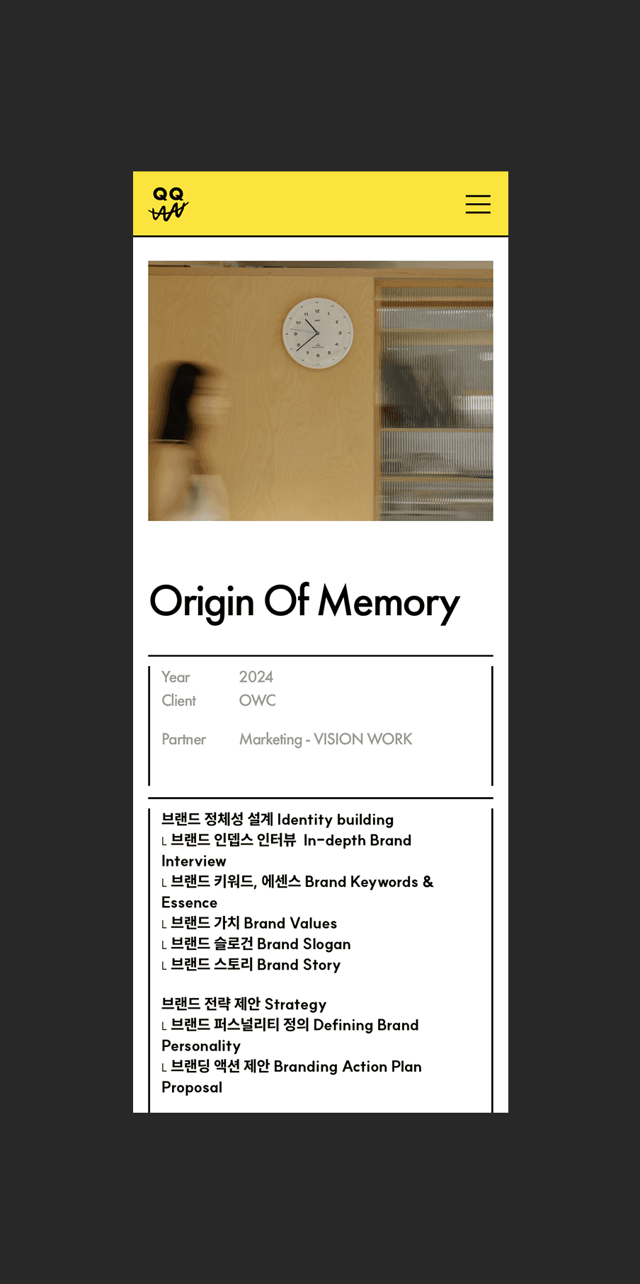 QQAA is a verbal brand consulting team that gives meaning to brands through language. We designed their digital presence to reflect the same clarity and philosophy that define their identity. Bold typography and the signature yellow color express QQAA’s confident voice, capturing a brand that communicates through words rather than images. Positioned at the forefront, the brand slogan becomes the first touchpoint — a quiet invitation into QQAA’s world.
