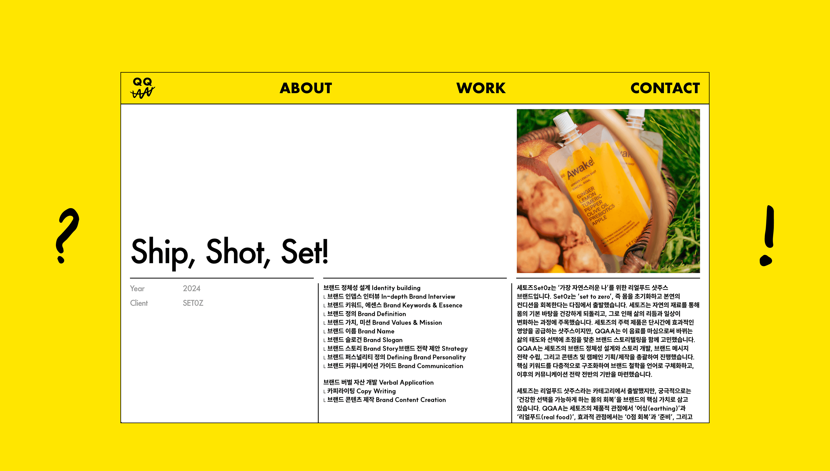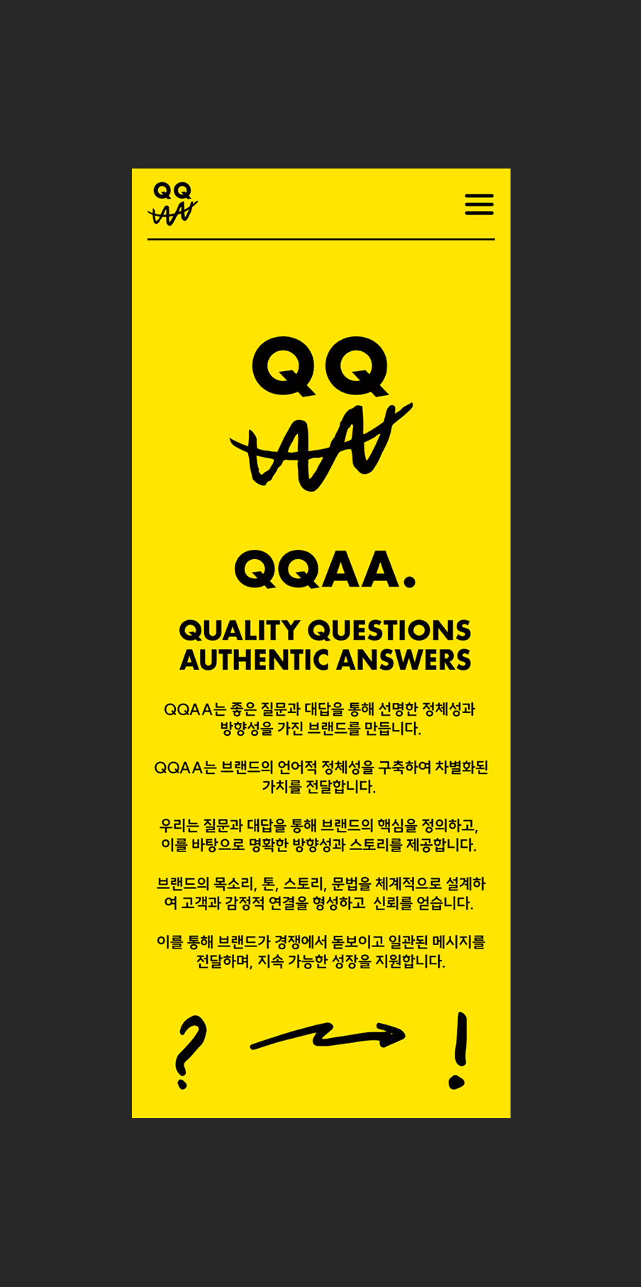 QQAA는 언어를 통해 브랜드의 가치를 전하는 버벌 브랜드 컨설팅 팀입니다. 우리는 그들의 철학과 아이덴티티가 디지털 환경에서도 일관되게 느껴질 수 있도록 웹사이트를 구현했습니다. 강한 타이포그래피와 포인트 컬러인 옐로우는 QQAA가 지닌 자신감과 명확한 언어를 시각적으로 표현하며, 이미지보다 문장의 힘으로 이야기를 전하는 그들의 본질을 그대로 담아냅니다. 화면 전면에 자리한 브랜드 슬로건은 QQAA의 세계로 사용자를 자연스럽게 이끄는 시작점이 됩니다.